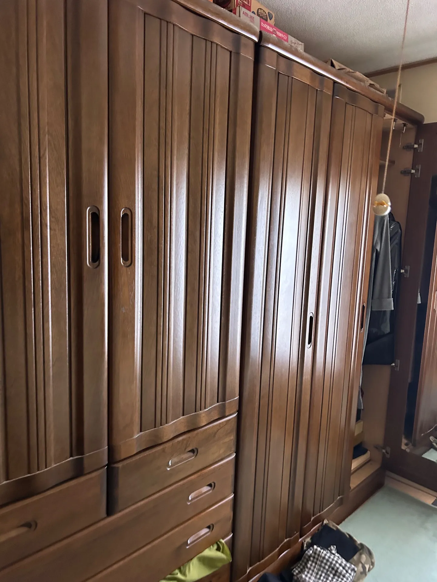 お部屋に残されていた衣類は非常に多く、押し入れやタンス、収納ケースにびっしりと詰まっていました。これらはリサイクル可能な資源として再利用できるため、一般廃棄物として処分するのではなく、提携先のリサイクルルートへ搬出。